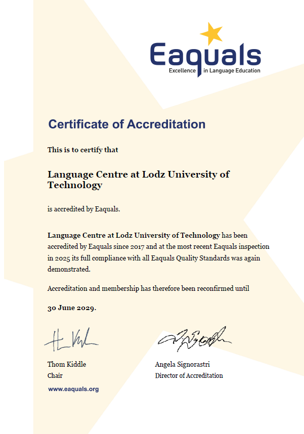 For students of Lodz University of Technology, the Eaquals quality certificate is a guarantee that language learning at Lodz University of Technology takes place in accordance with best European practices. For the University, this is a prestigious asset in the process of internationalization – a diploma of completion of a language course supported by Eaquals accreditation is a recognizable symbol of language competence on the international labor market.